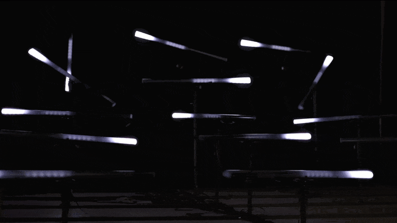 A large-scale installation and exploration of connection and emergent behavior through motion and communion with its viewers. The project was inspired by personal experimental music notation sketches, kinesthetics and body movement patterns, and the liminal spaces we traverse individually and collectively. It is a response to the rhythmic nature of human visual perception as its light sequences shift in response to environmental changes. The installation's elevation increases with each row as the light tubes cascade through the exhibition space.