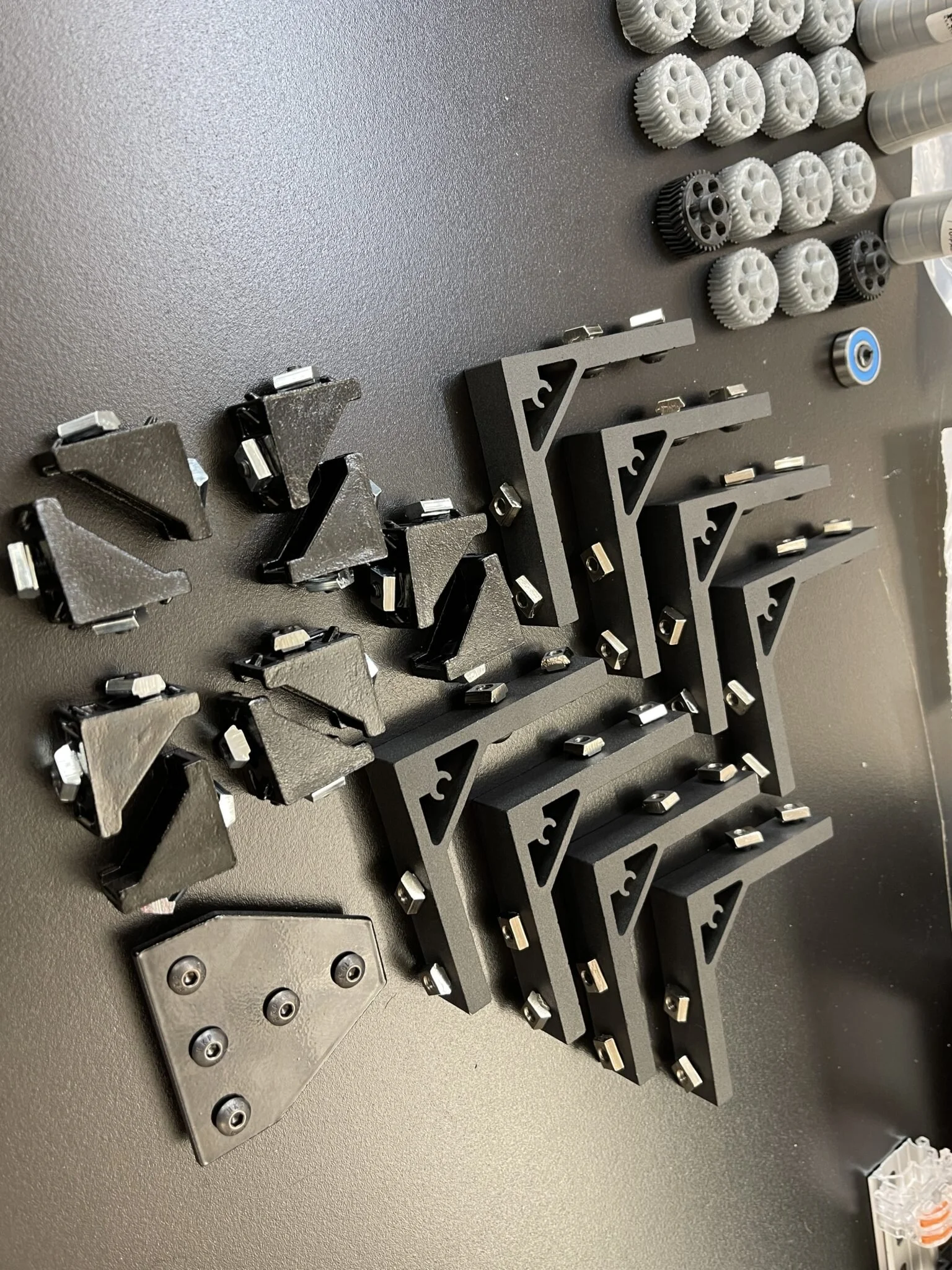 Every single piece of aluminum extrusion is sized according to the standard sizes readily available, with the vertical pieces organized in exponential gradient heights from the first row to the last row and with the rows connected by two 2m extrusions to make them long enough. The bottom pieces are connected with 90-degree angle brackets, while all the vertical parts will be mounted according to the height to balance the cost and the stability.