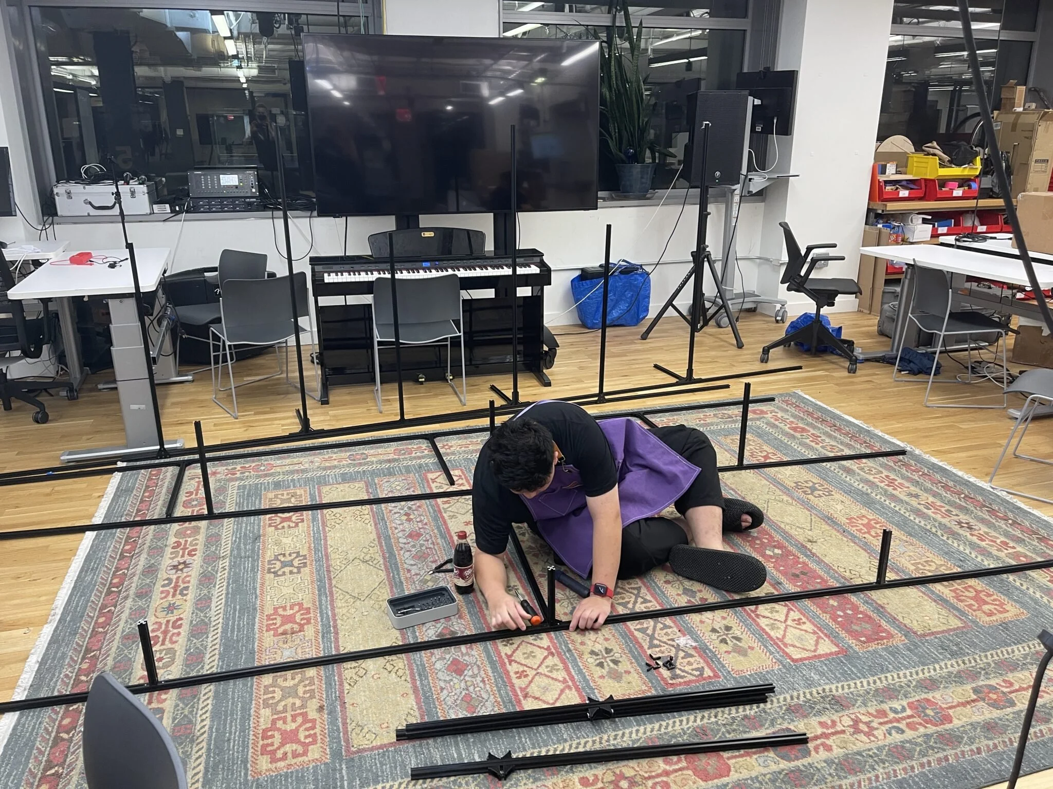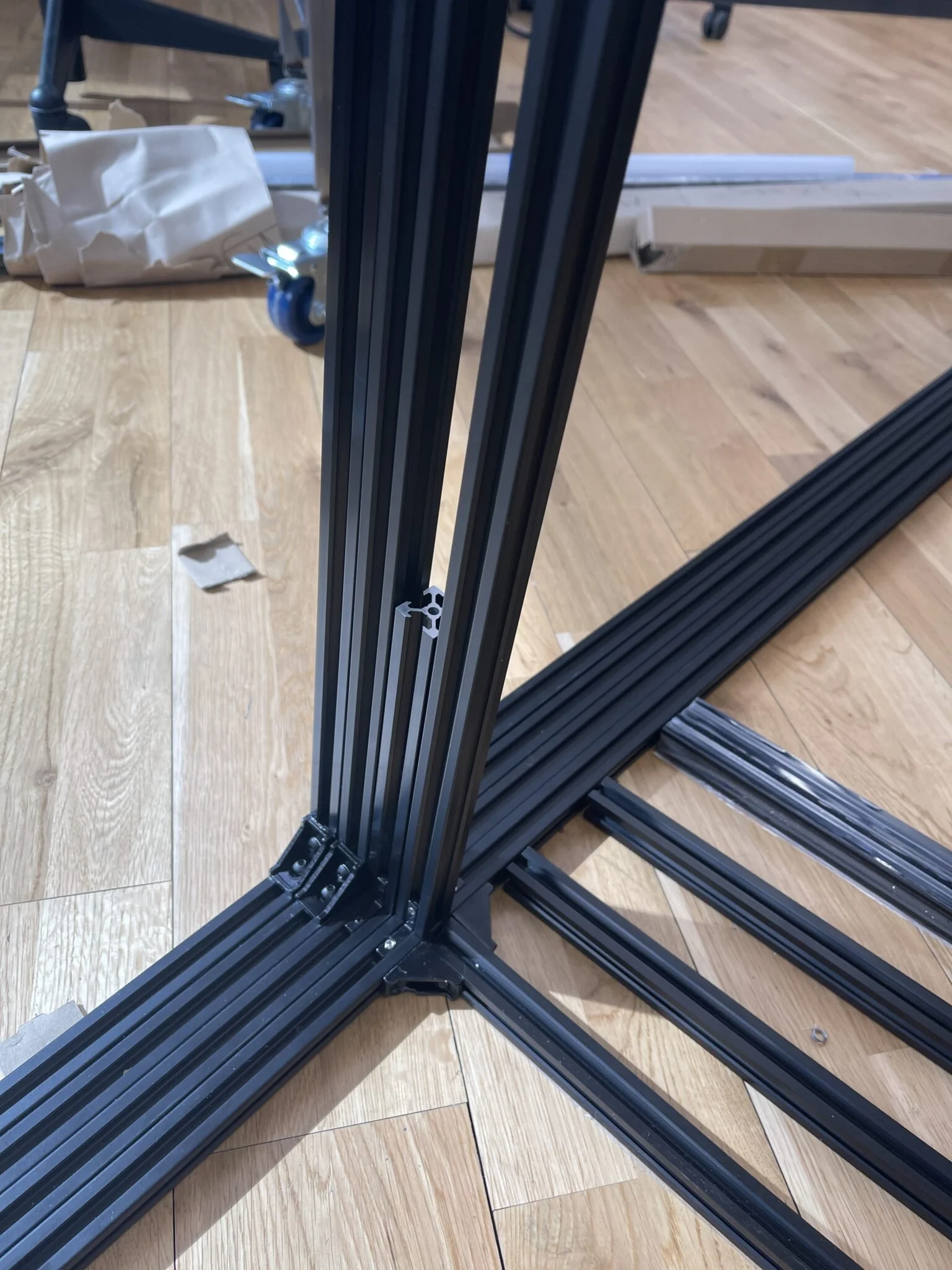 When the assigned installation time started, we moved the structure to the spot. Each row was kept assembled with the vertical parts to save time, but it turns out that moving 4m extrusions downstairs is quite painful.