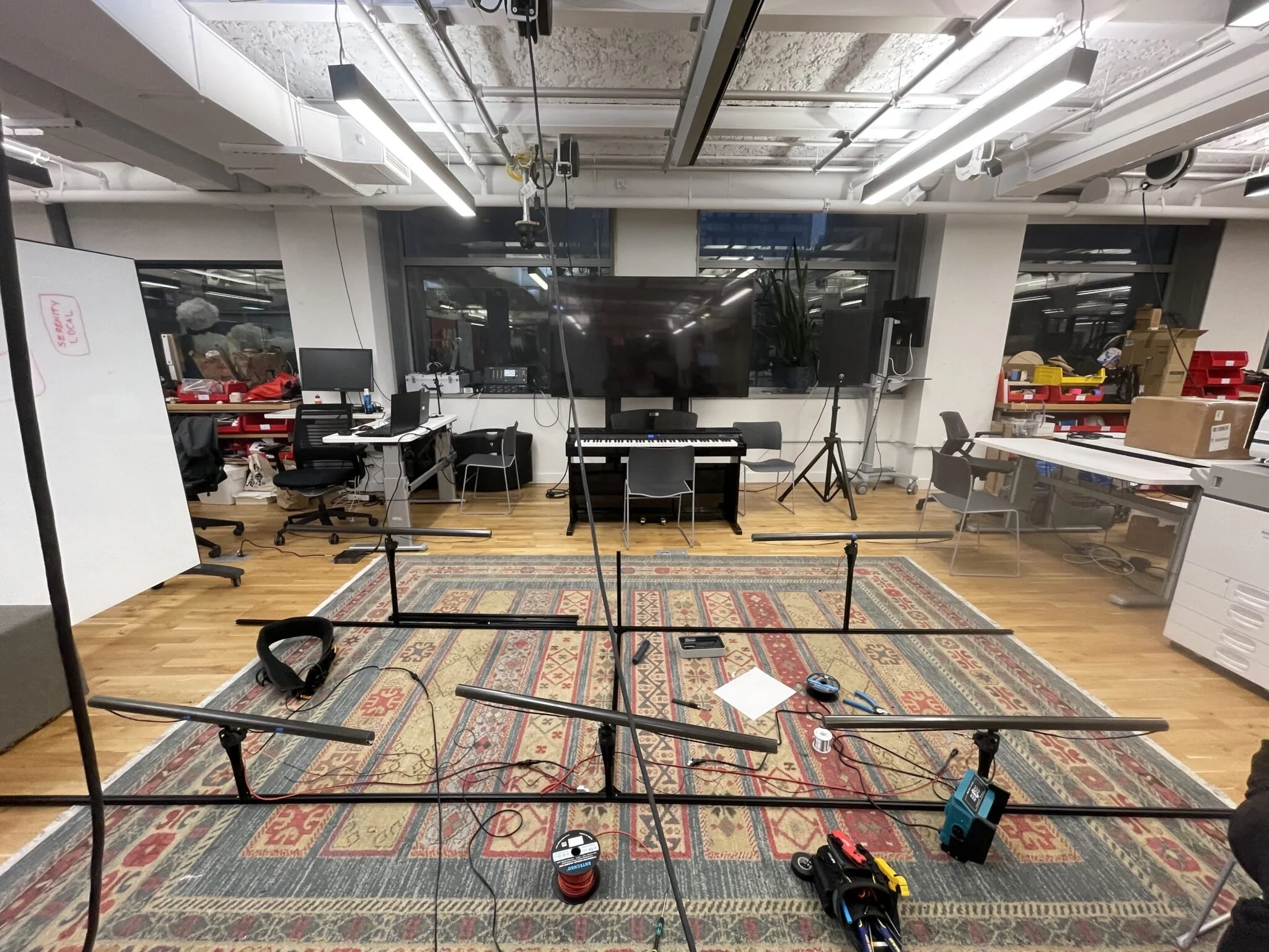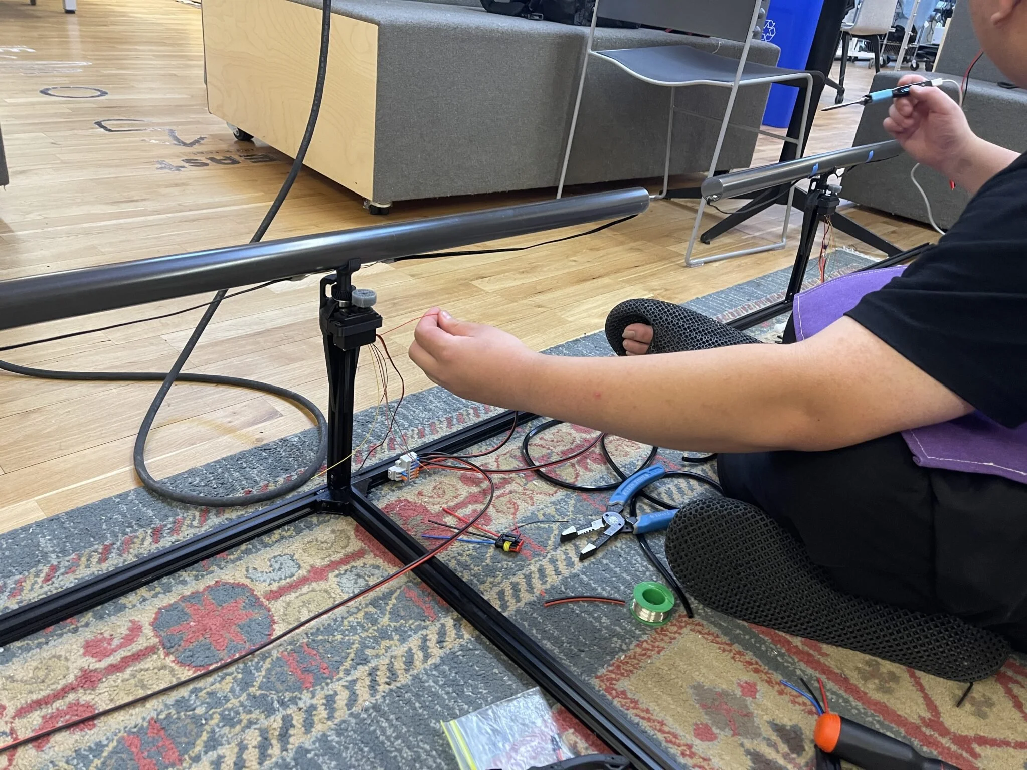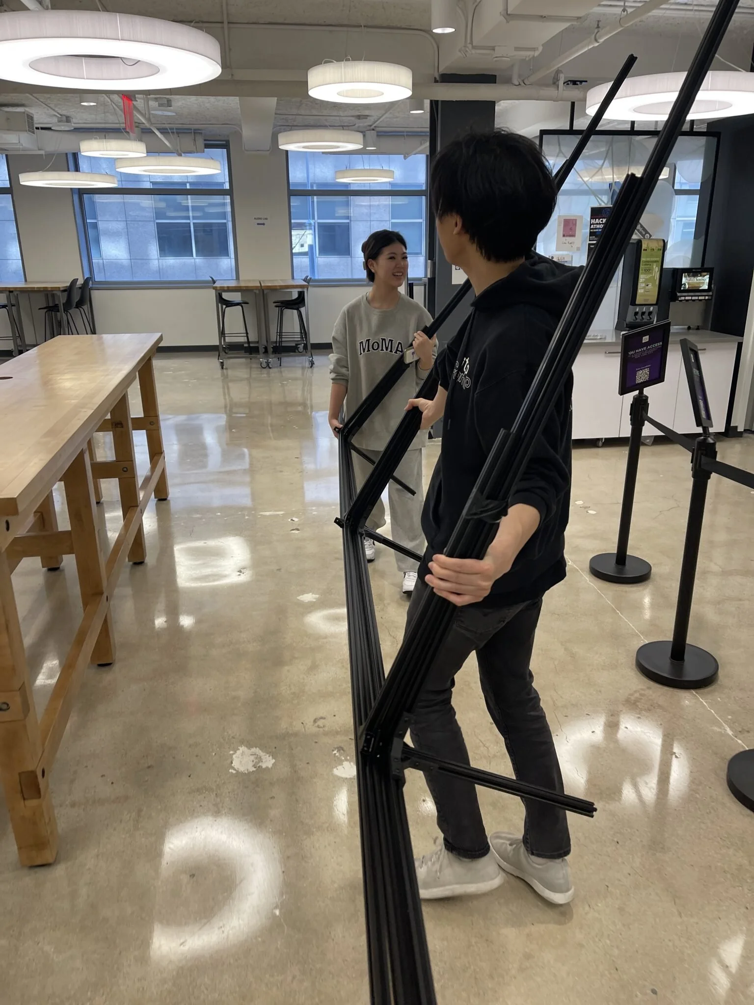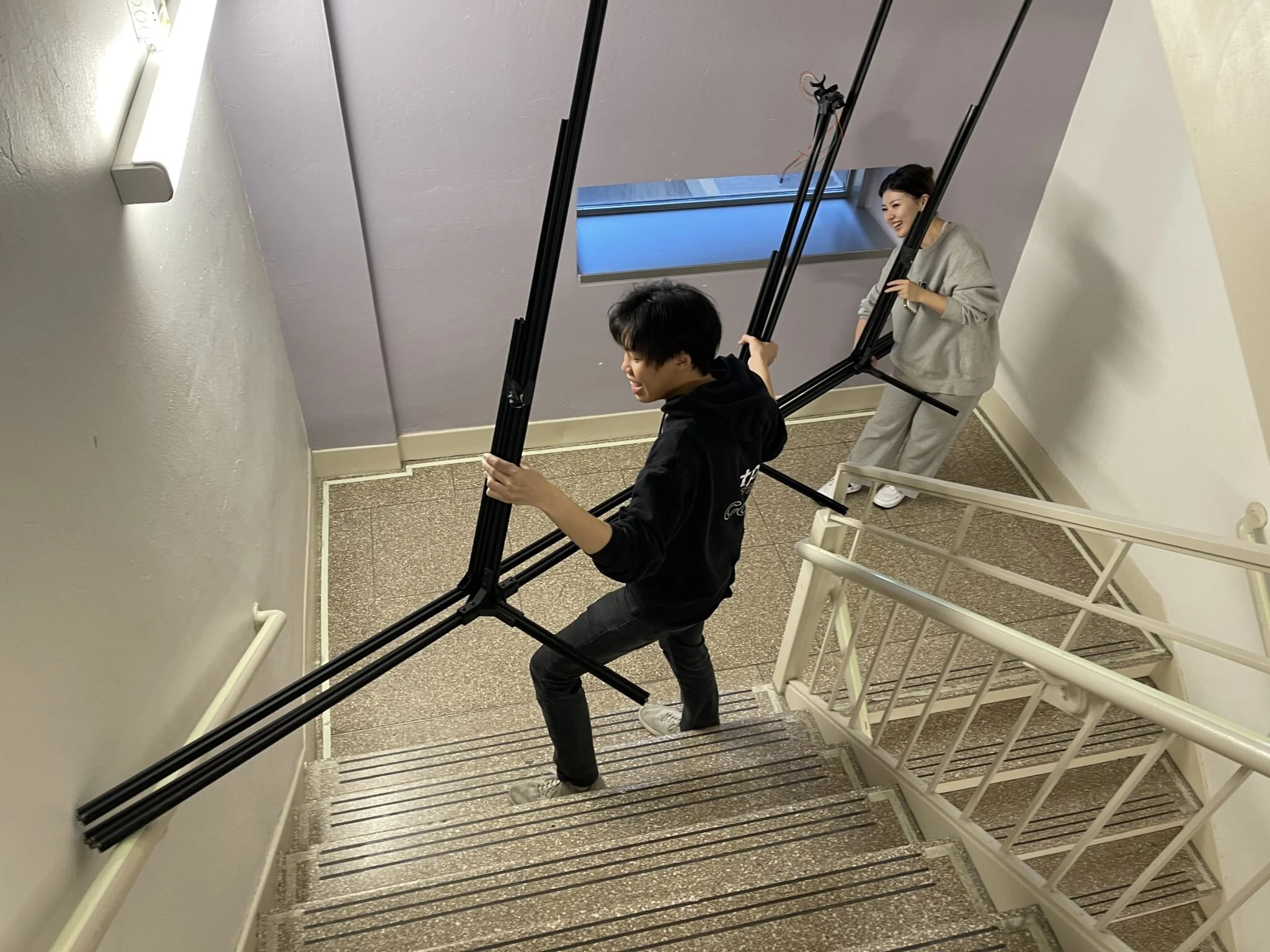 When the assigned installation time started, we moved the structure to the spot. Each row was kept assembled with the vertical parts to save time, but it turns out that moving 4m extrusions downstairs is quite painful.