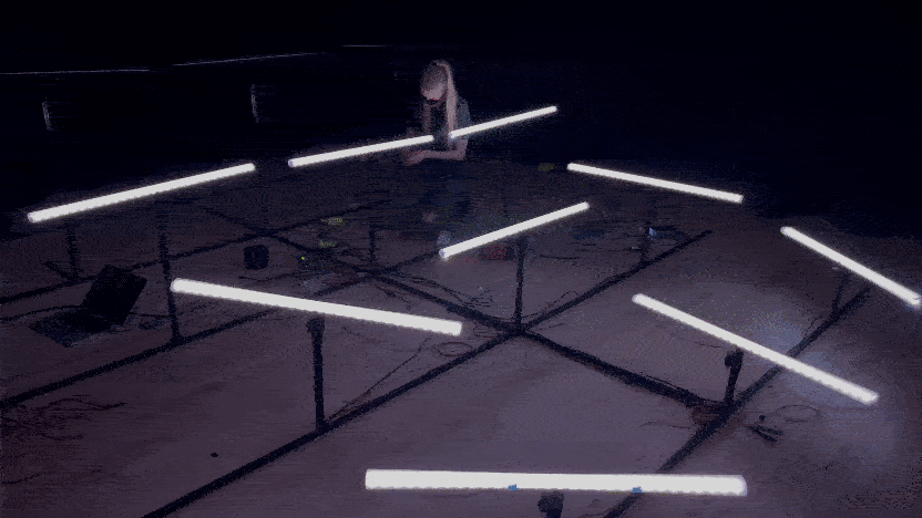 A large-scale installation and exploration of connection and emergent behavior through motion and communion with its viewers. The project was inspired by personal experimental music notation sketches, kinesthetics and body movement patterns, and the liminal spaces we traverse individually and collectively. It is a response to the rhythmic nature of human visual perception as its light sequences shift in response to environmental changes. The installation's elevation increases with each row as the light tubes cascade through the exhibition space.